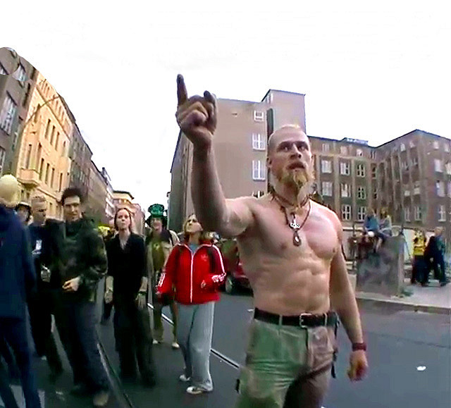 When the video was recorded he was in a musical manifestation on the street called Fuck Parade, which was protesting against another event, the Loveparade. He was with his pals, having fun, and following the rules of the party: no violence and respect for your peers.